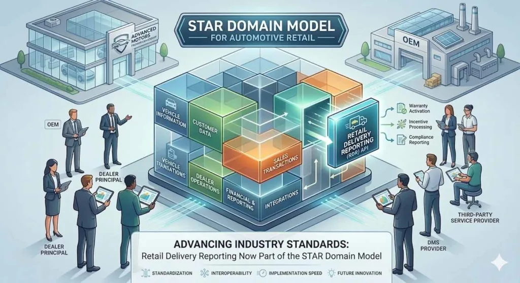 Today a major milestone has been reached: The Retail Delivery Report (RDR) API and associated schema elements are now part of STAR’s Domain Model for Automotive Retail.